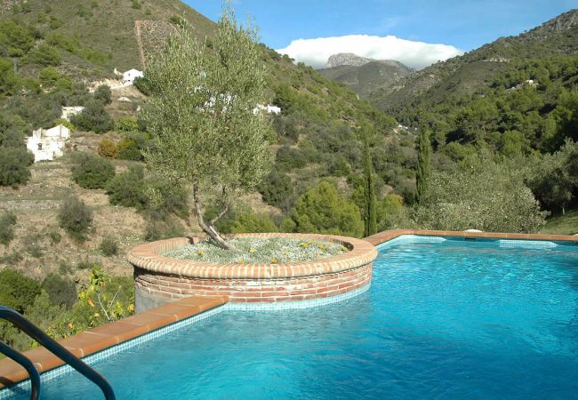 Rustiek, privé en landelijk. Dat is de essentie van deze heerlijke locatie. Na een mooie autorit door de bergen ontdekt u deze verborgen vallei, 10 minuten rijden van Frigiliana. De toegangsweg heeft een paar scherpe bochten, maar is volledig verhard en niet moeilijk om te rijden. De "cortijo" is omgeven door een grote tuin met verschillende zithoekjes met bloemen en bomen. Er is een aantrekkelijk barbecuegedeelte en een schaduwrijke veranda met meubilair. Het privé zwembad van 7 x 4 meter (met ligstoelen) ligt op een wat hoger niveau met panoramische uitzichten over het dal en over het 1 kilometer verderop gelegen buurtschap El Acebuchal, een klein dorpje met een interessante geschiedenis: nadat de inwoners in 1949 door het Franco regime waren verdreven bleef El Acebuchal lange tijd onbewoond en raakte in verval. Totdat in 1998 een nakomeling van een van de oorspronkelijke bewoners er een huis kocht en anderen aanmoedigde om de 32 huizen, het stadhuis, de kapel, de bars en de straten waaruit het dorp bestond te helpen opbouwen. Om het buurtschap weer terug te brengen in zijn oude glorie werd de renovatie zeer zorgvuldig uitgevoerd, met oog voor detail. Geen winkels hier, maar wel een bar-restaurant dat regionale specialiteiten serveert, zoals wild zwijn en geitengerechten. In Frigiliana, een van de z.g. witte dorpen en een bezoek meer dan waard, vindt u een uitgebreid aanbod aan winkels, tapasbars en restaurants. Bezoek aan Nerja (9 kilometer) is eveneens de moeite waard: u kunt er genieten van de mooiste stranden en een duikje nemen in de Middellandse zee.