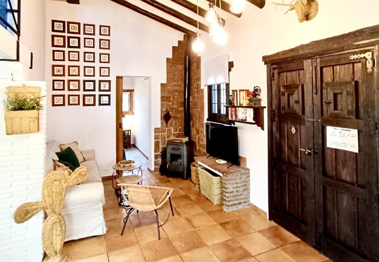 Het huisje is ingericht in de typisch rustieke stijl van Andalusië met blauw/witte tinten. Het is praktisch ingedeeld met een knusse open zitkamer met aangrenzend de eethoek en de keuken. Het woongedeelte is voorzien van een bankstel voor 4 personen, een houtkachel en satelliettelevisie met dvd-speler. De keuken is functioneel ingericht met een 4-persoons eettafel, een keramische kookplaat, een koelkast/vriezer, magnetron, een vaatwasser, een kleine elektrische oven en alle gebruikelijke keukenbenodigdheden. De wasmachine staat in de bijkeuken. U vindt in dit intieme cortijo twee slaapkamers: een kamer met een tweepersoonsbed en een kamer met twee aparte bedden. De gezamenlijke doucheruimte is voorzien van een wastafel en toilet.