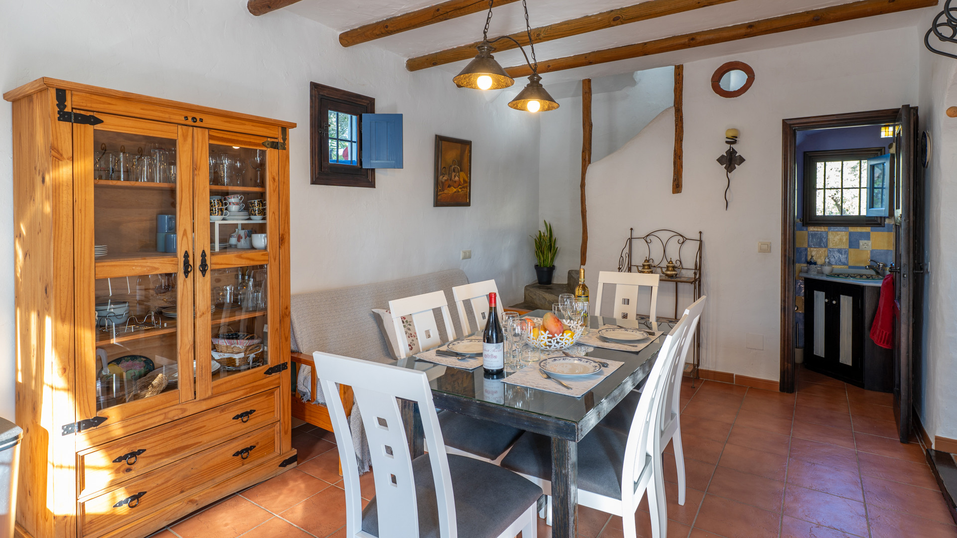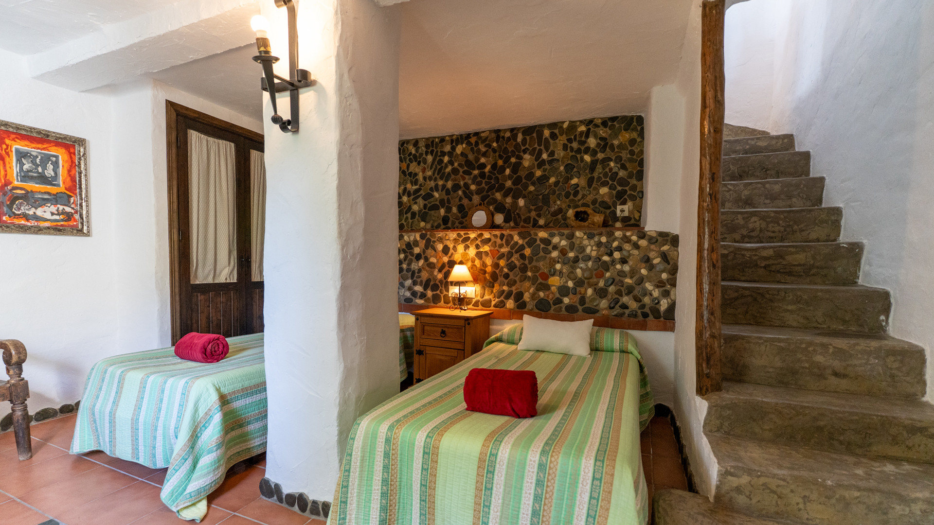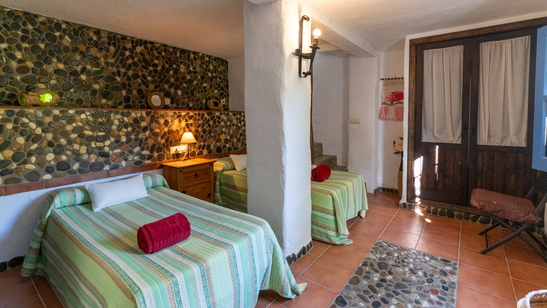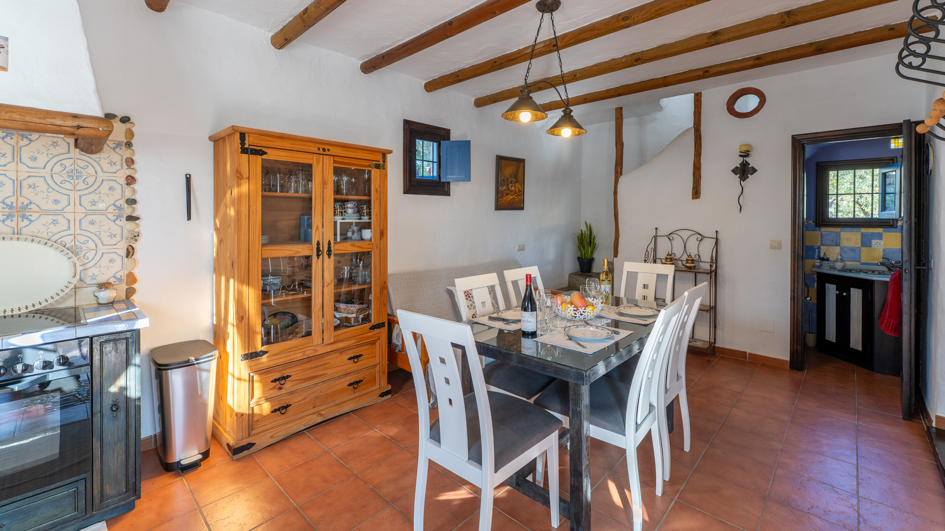 Dezelfde zorg waarmee Jose Manuel en Pilar de buitenruimtes omgeven zien we ook binnen: het huis is ingericht in harmonie met de authentieke Andalusische traditie, het meubilair met liefde voor de lokale stijl uitgekozen. Er is een ruime eetkamer/keuken met toegang tot de zitkamer met twee banken, een open haard en satelliettelevisie. De open keuken heeft prachtige originele tegels die langs de randen zijn afgewerkt met kiezelsteen en in weerwil van de ouderwetse koperen kraan is de keuken voorzien van alle moderne comfort zoals een 4-pits keramische kookplaat, een magnetron, koelkast/vriezer en een vaatwasser. De wasmachine vindt u naast het barbecuegedeelte buiten. Boven bevinden zich twee romantische slaapkamers (een kamer met een tweepersoonsbed en een kamer met twee aparte bedden) met houten balkenplafonds en een complete doucheruimte. De derde slaapkamer in het souterrain verdient extra aandacht voor haar design: het hoofdbord achter de twee apart van elkaar staande bedden bestaat geheel uit kiezelstenen, een minutieus en tijdrovend handwerk van Jose Manuel zelf! Deze slaapkamer heeft een eigen doucheruimte met wastafel en toilet. In het buitengebied, naast het zwembad, vindt u de vierde slaapkamer, met een tweepersoonsbed en een ensuite douchekamer.