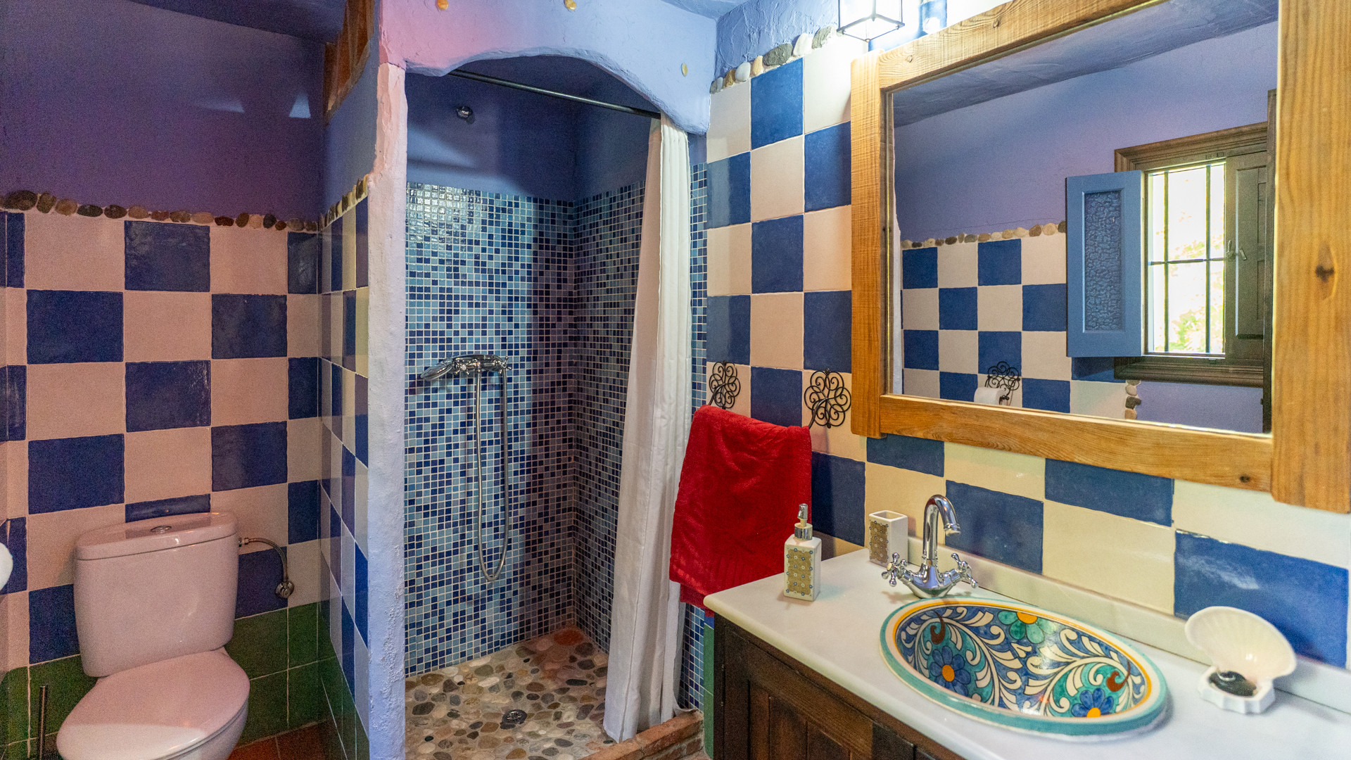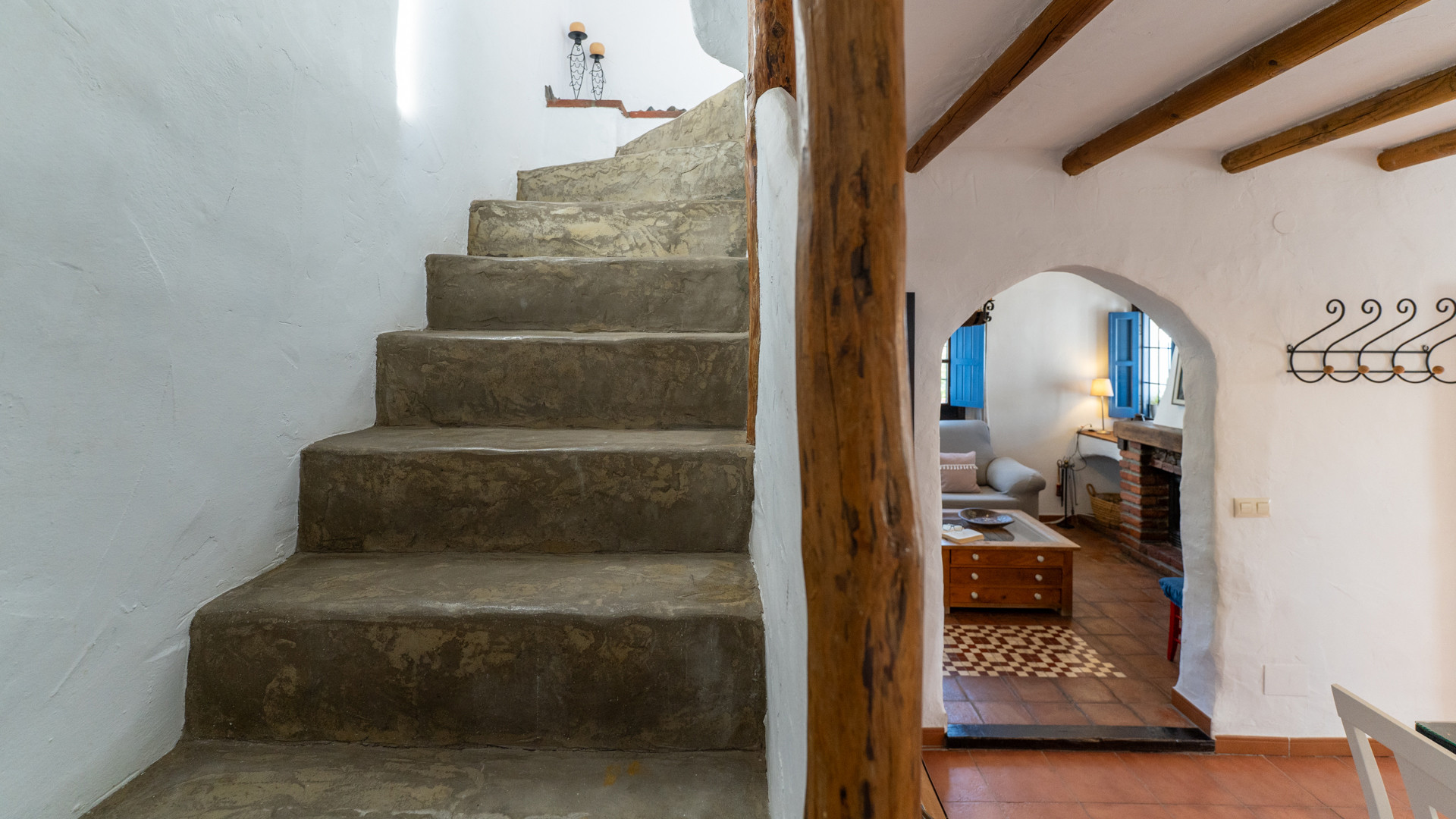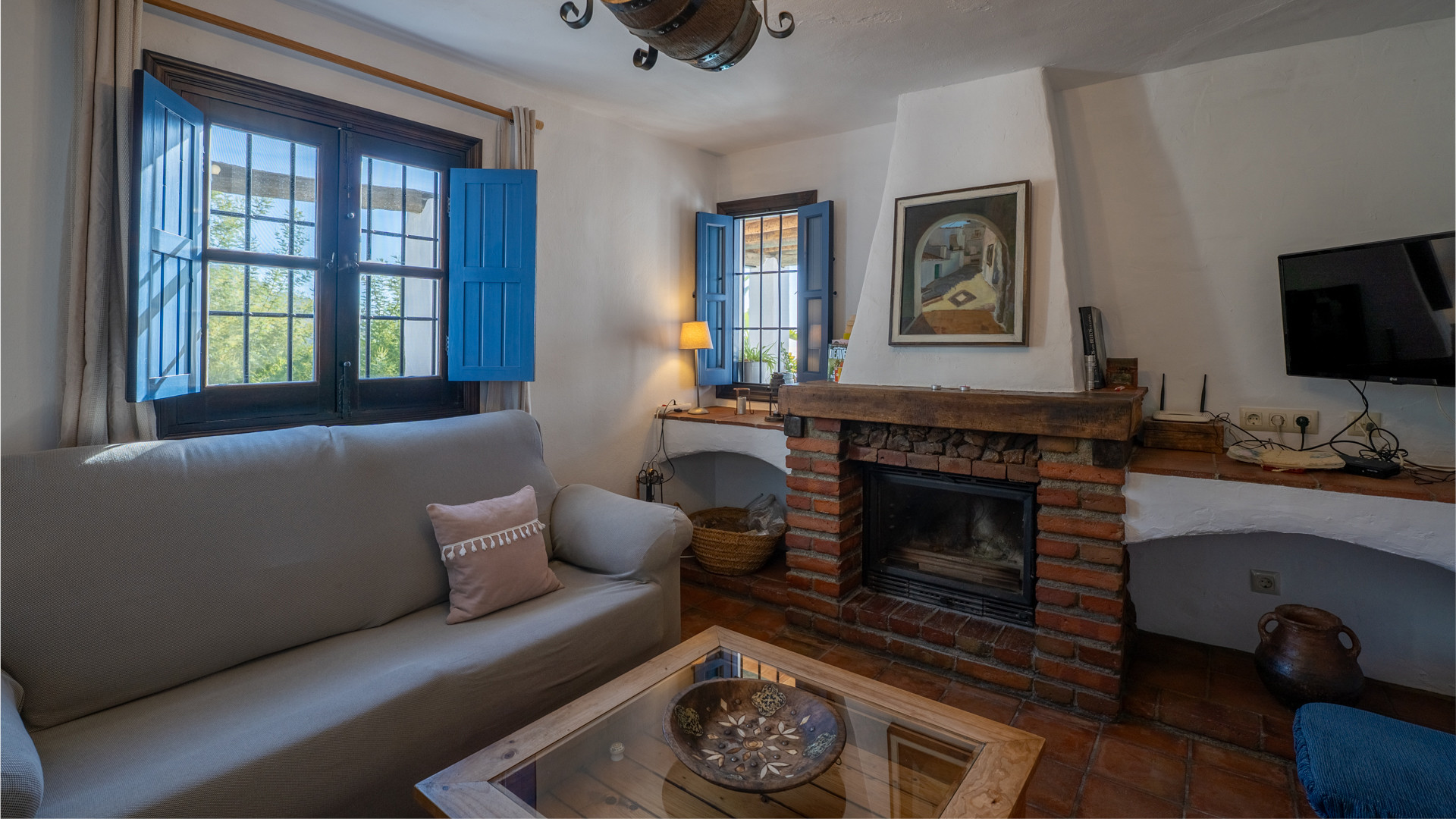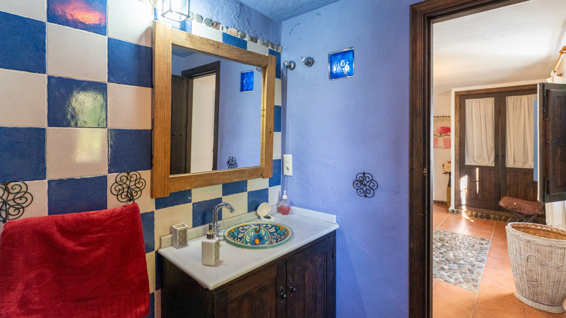 Dezelfde zorg waarmee Jose Manuel en Pilar de buitenruimtes omgeven zien we ook binnen: het huis is ingericht in harmonie met de authentieke Andalusische traditie, het meubilair met liefde voor de lokale stijl uitgekozen. Er is een ruime eetkamer/keuken met toegang tot de zitkamer met twee banken, een open haard en satelliettelevisie. De open keuken heeft prachtige originele tegels die langs de randen zijn afgewerkt met kiezelsteen en in weerwil van de ouderwetse koperen kraan is de keuken voorzien van alle moderne comfort zoals een 4-pits keramische kookplaat, een magnetron, koelkast/vriezer en een vaatwasser. De wasmachine vindt u naast het barbecuegedeelte buiten. Boven bevinden zich twee romantische slaapkamers (een kamer met een tweepersoonsbed en een kamer met twee aparte bedden) met houten balkenplafonds en een complete doucheruimte. De derde slaapkamer in het souterrain verdient extra aandacht voor haar design: het hoofdbord achter de twee apart van elkaar staande bedden bestaat geheel uit kiezelstenen, een minutieus en tijdrovend handwerk van Jose Manuel zelf! Deze slaapkamer heeft een eigen doucheruimte met wastafel en toilet. In het buitengebied, naast het zwembad, vindt u de vierde slaapkamer, met een tweepersoonsbed en een ensuite douchekamer.