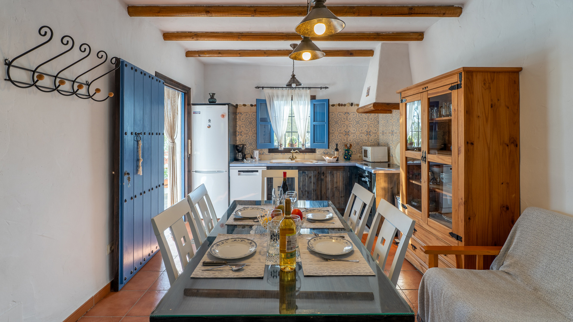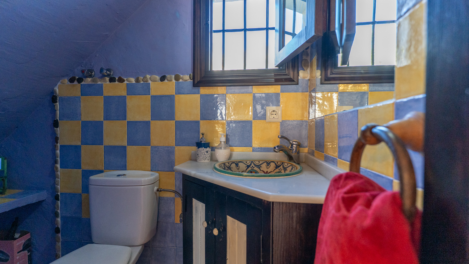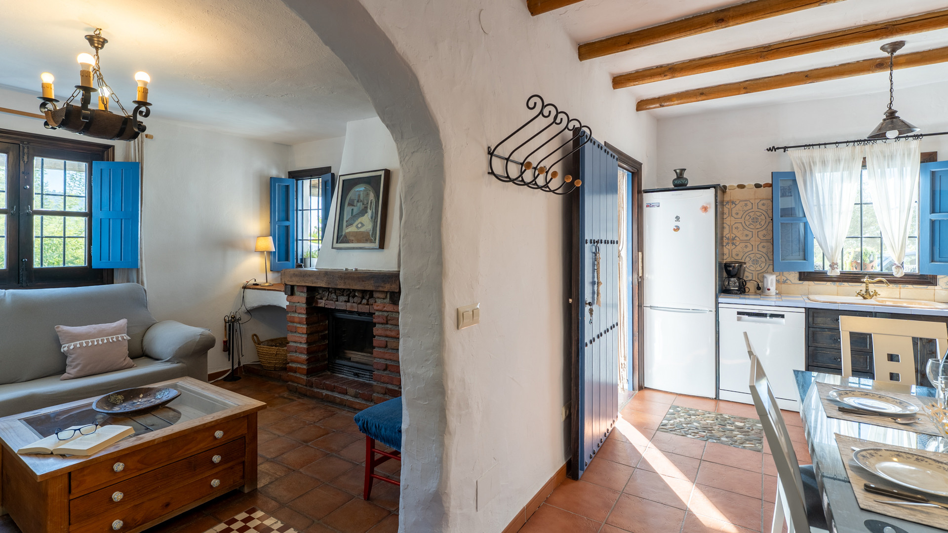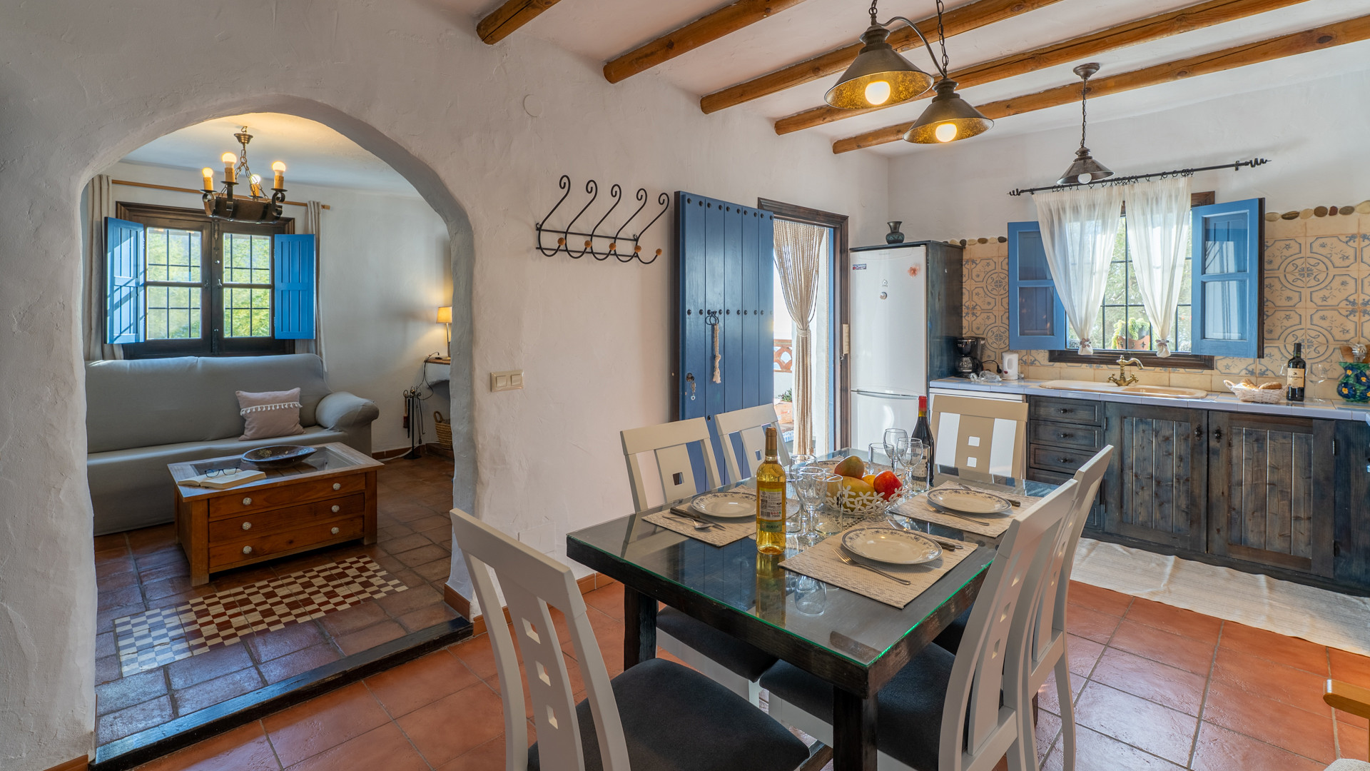 Dezelfde zorg waarmee Jose Manuel en Pilar de buitenruimtes omgeven zien we ook binnen: het huis is ingericht in harmonie met de authentieke Andalusische traditie, het meubilair met liefde voor de lokale stijl uitgekozen. Er is een ruime eetkamer/keuken met toegang tot de zitkamer met twee banken, een open haard en satelliettelevisie. De open keuken heeft prachtige originele tegels die langs de randen zijn afgewerkt met kiezelsteen en in weerwil van de ouderwetse koperen kraan is de keuken voorzien van alle moderne comfort zoals een 4-pits keramische kookplaat, een magnetron, koelkast/vriezer en een vaatwasser. De wasmachine vindt u naast het barbecuegedeelte buiten. Boven bevinden zich twee romantische slaapkamers (een kamer met een tweepersoonsbed en een kamer met twee aparte bedden) met houten balkenplafonds en een complete doucheruimte. De derde slaapkamer in het souterrain verdient extra aandacht voor haar design: het hoofdbord achter de twee apart van elkaar staande bedden bestaat geheel uit kiezelstenen, een minutieus en tijdrovend handwerk van Jose Manuel zelf! Deze slaapkamer heeft een eigen doucheruimte met wastafel en toilet. In het buitengebied, naast het zwembad, vindt u de vierde slaapkamer, met een tweepersoonsbed en een ensuite douchekamer.