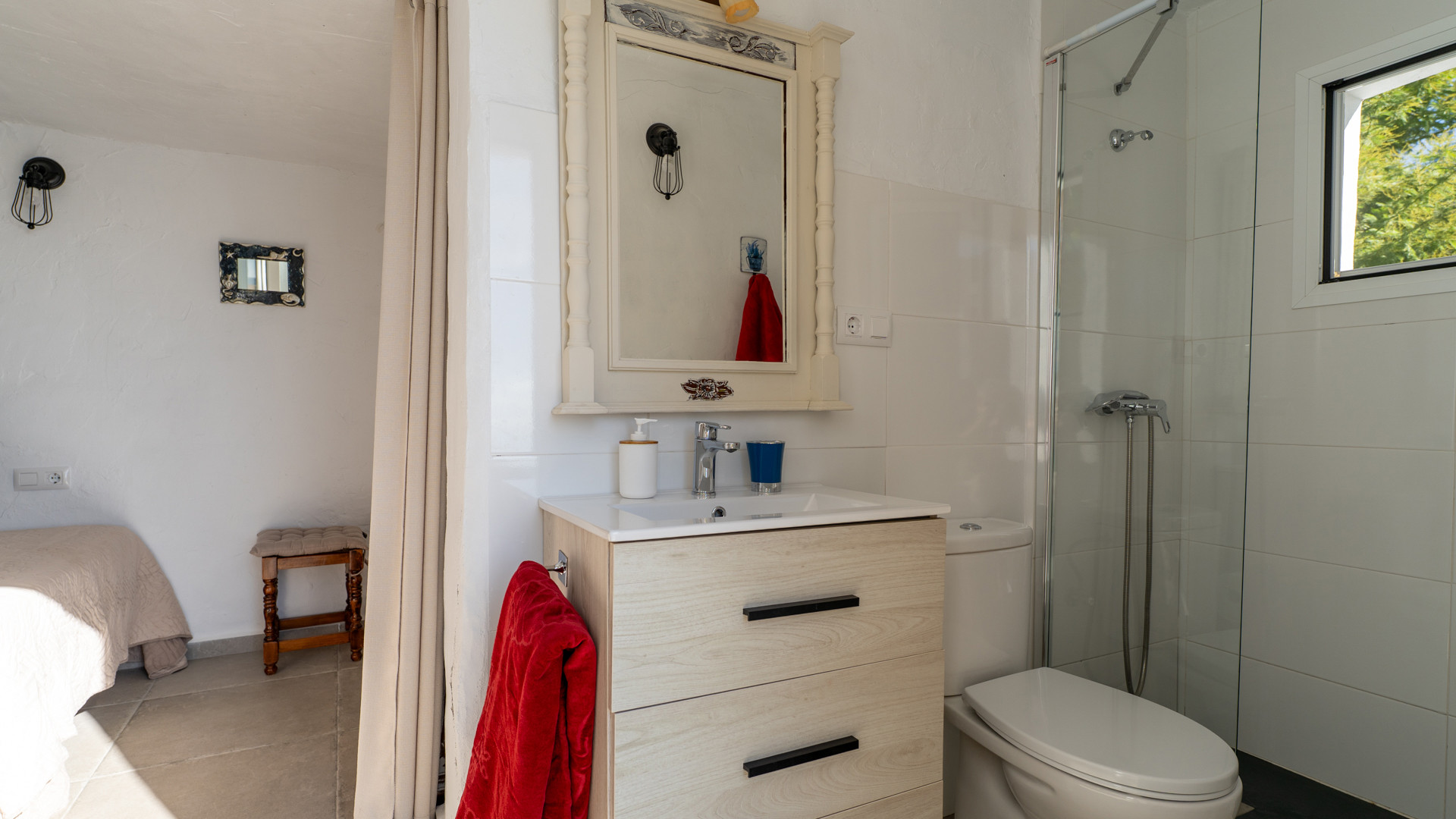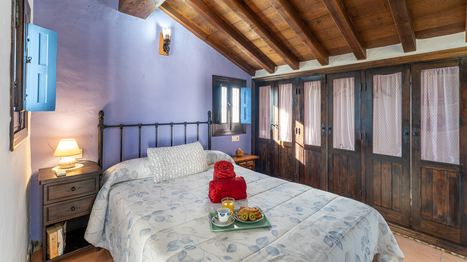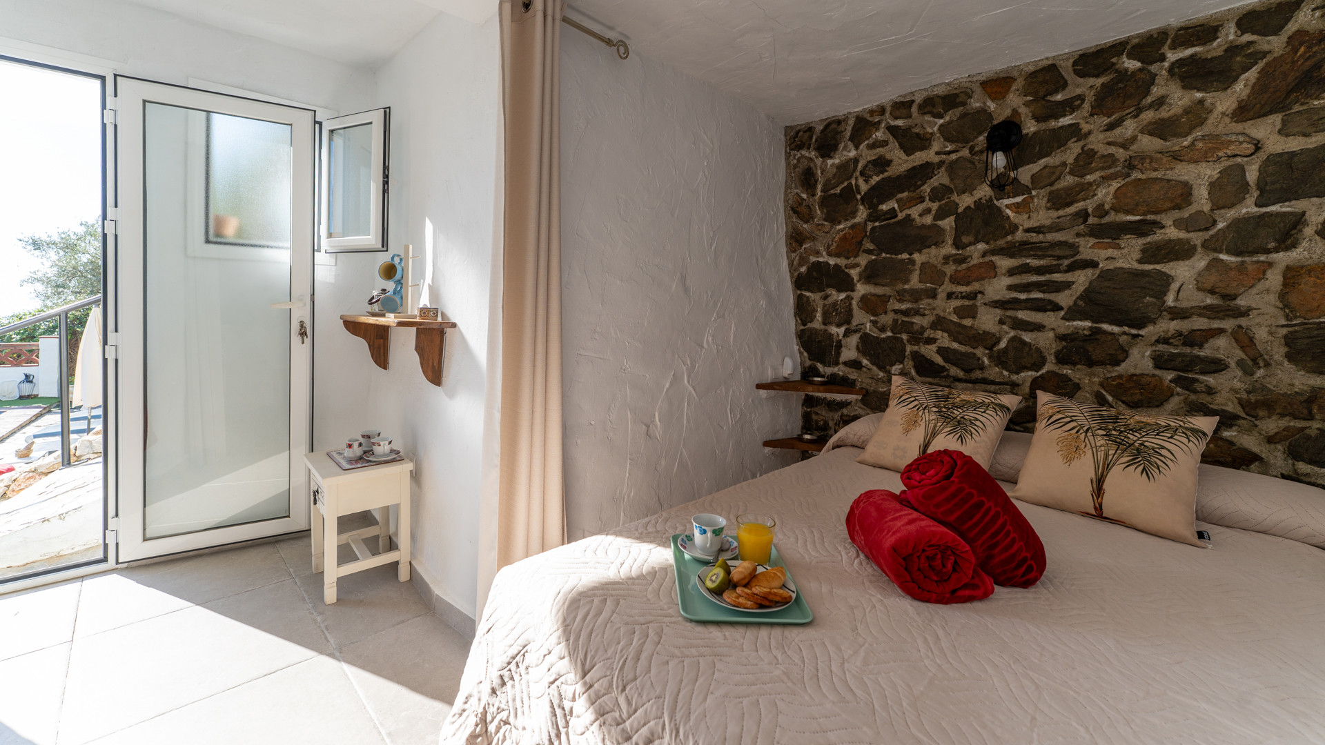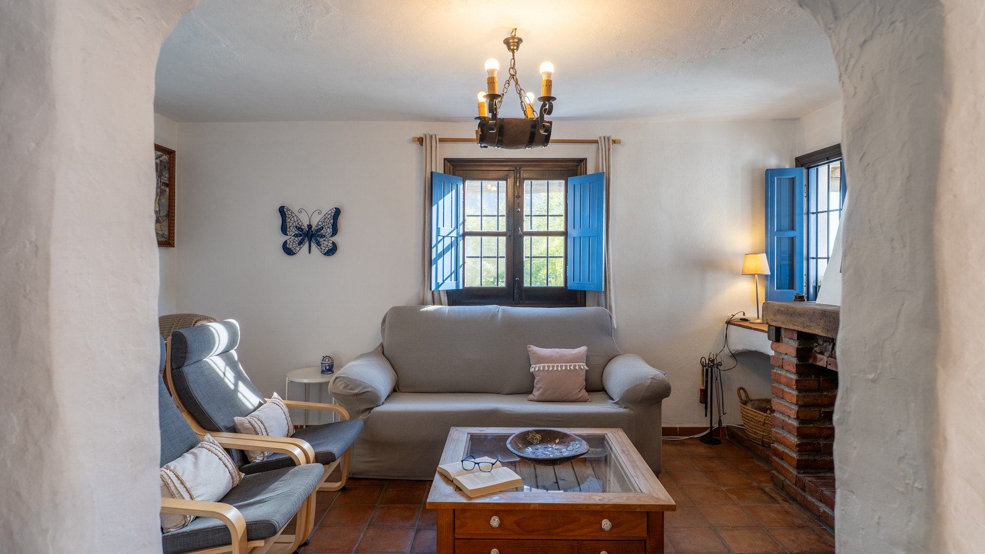 Dezelfde zorg waarmee Jose Manuel en Pilar de buitenruimtes omgeven zien we ook binnen: het huis is ingericht in harmonie met de authentieke Andalusische traditie, het meubilair met liefde voor de lokale stijl uitgekozen. Er is een ruime eetkamer/keuken met toegang tot de zitkamer met twee banken, een open haard en satelliettelevisie. De open keuken heeft prachtige originele tegels die langs de randen zijn afgewerkt met kiezelsteen en in weerwil van de ouderwetse koperen kraan is de keuken voorzien van alle moderne comfort zoals een 4-pits keramische kookplaat, een magnetron, koelkast/vriezer en een vaatwasser. De wasmachine vindt u naast het barbecuegedeelte buiten. Boven bevinden zich twee romantische slaapkamers (een kamer met een tweepersoonsbed en een kamer met twee aparte bedden) met houten balkenplafonds en een complete doucheruimte. De derde slaapkamer in het souterrain verdient extra aandacht voor haar design: het hoofdbord achter de twee apart van elkaar staande bedden bestaat geheel uit kiezelstenen, een minutieus en tijdrovend handwerk van Jose Manuel zelf! Deze slaapkamer heeft een eigen doucheruimte met wastafel en toilet. In het buitengebied, naast het zwembad, vindt u de vierde slaapkamer, met een tweepersoonsbed en een ensuite douchekamer.