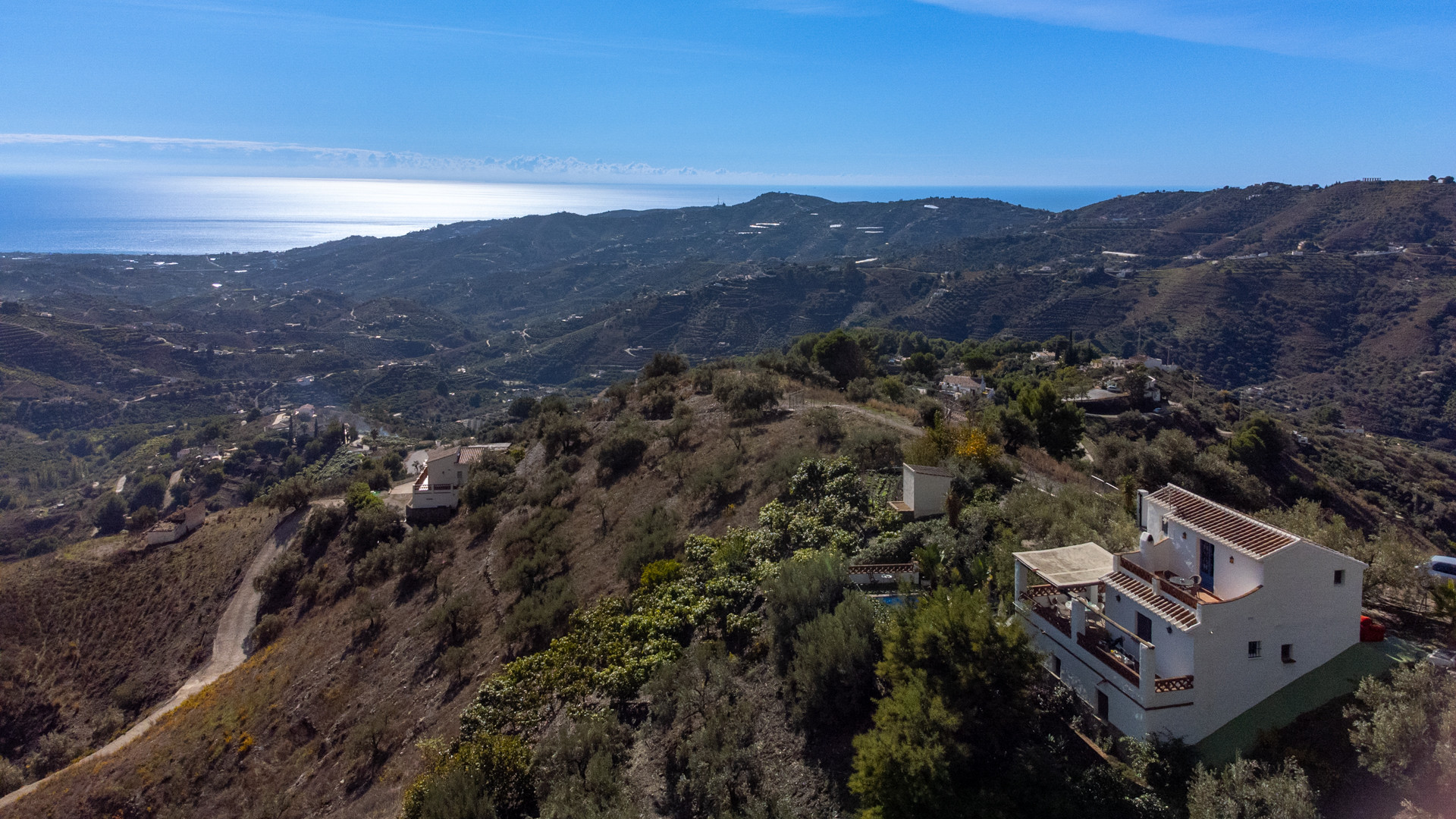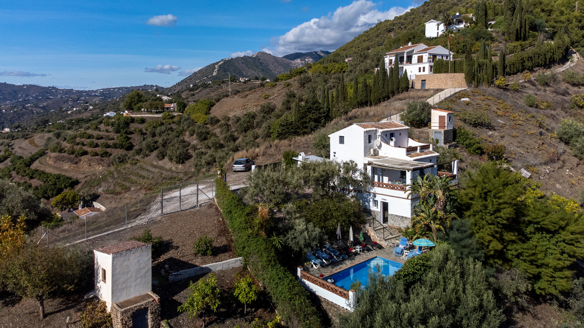 Er zijn 2 mogelijkheden om het huis te bereiken: het langst is de volledig verharde 4.5 kilometer lange weg vanaf Frigiliana. De alternatieve toegangsweg is wat avontuurlijker: 2.3 kilometer via een weg met hier en daar wat onverharde stukken maar in redelijke conditie en met een gewone auto te rijden.