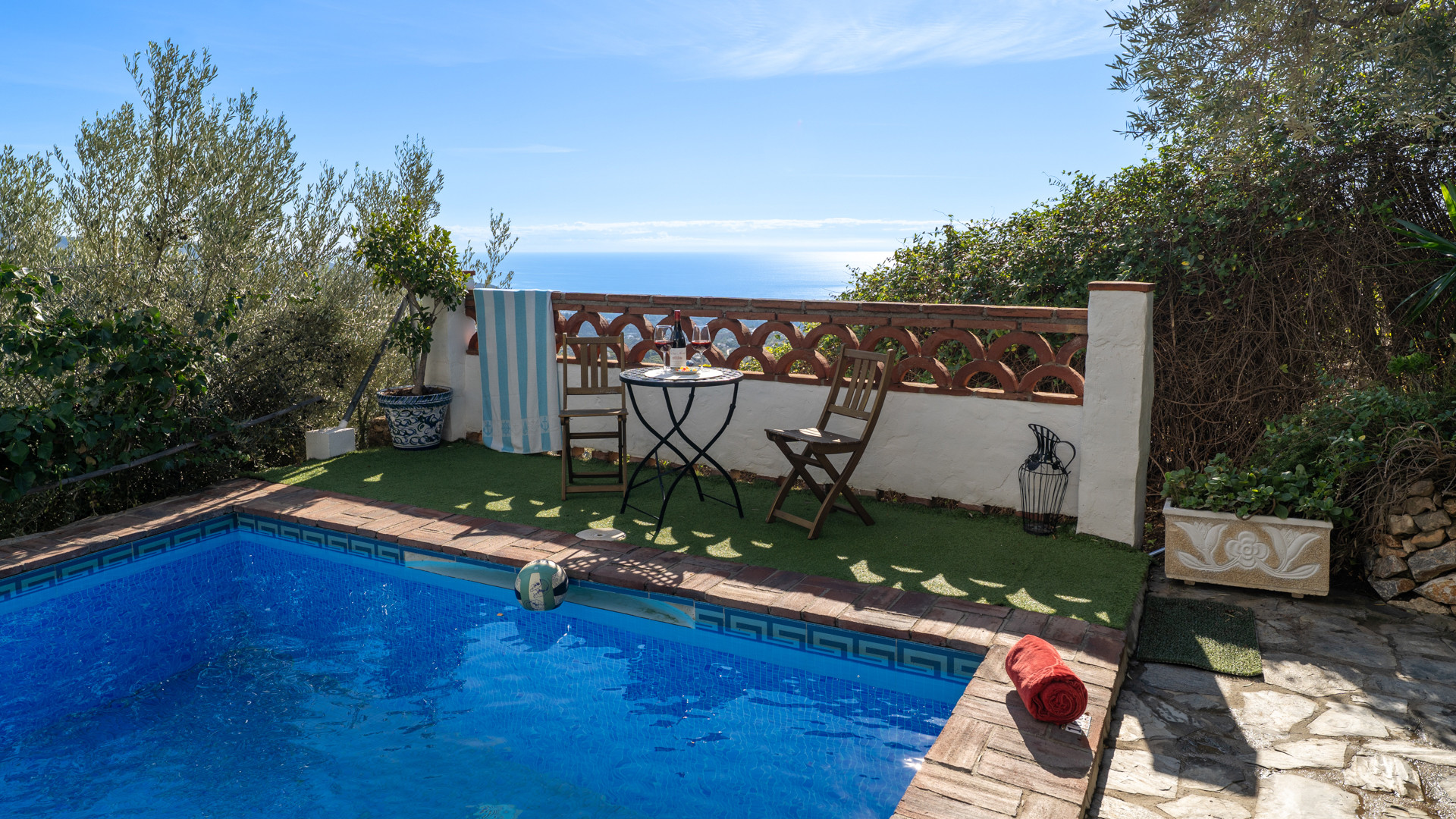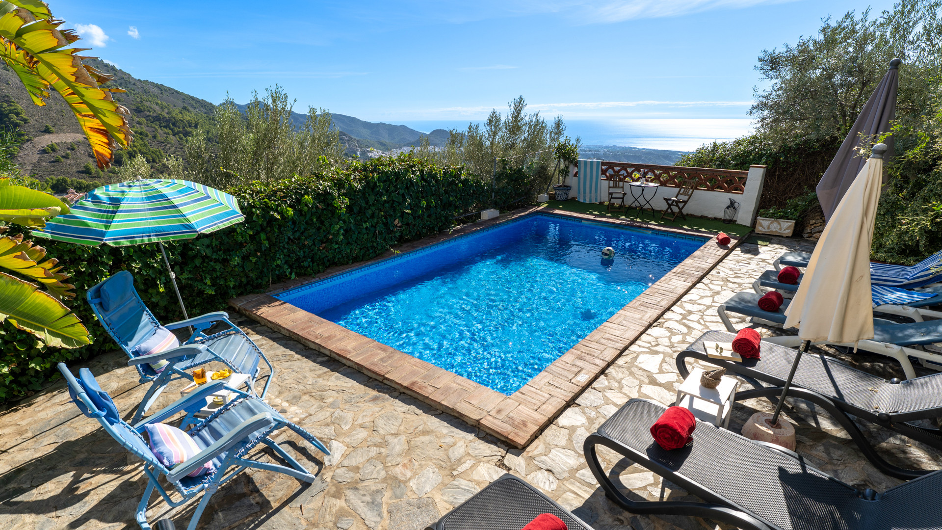 Dit landhuis ligt in de bergen, 3,5 kilometer ten Noorden van Frigiliana. Vanaf uw plekje bij het zwembad zult u versteld staan van de meest verbluffende panoramische uitzichten over de bergen, het dorp Frigiliana en de stad Nerja met in de verte de Middellandse Zee. Buiten hebben de eigenaren ook met veel zorg een sfeer gecreëerd die in harmonie is met de prachtige omgeving; een combinatie van olijfbomen met natuursteen en handgemaakte stenen. Hier vindt u alles wat u nodig heeft voor een perfecte vakantie: een privé zwembad van 7x4 meter en 1–1.6 meter diep, een zonneterras met ligstoelen, een barbecue en comfortabel patiomeubilair om lekker buiten te eten. Via een slingerende, volledig met asfalt en beton verharde weg door de bergen bereikt u deze mooie finca. Hoewel de ervaring heeft geleerd dat gasten er snel aan wennen, kan het laatste smalle deel (ca.60 meter) van de weg lastig zijn voor mensen met een wat nerveuzere aard.
