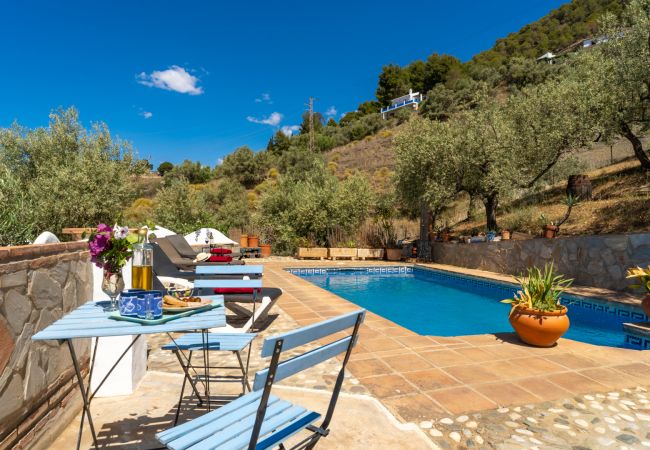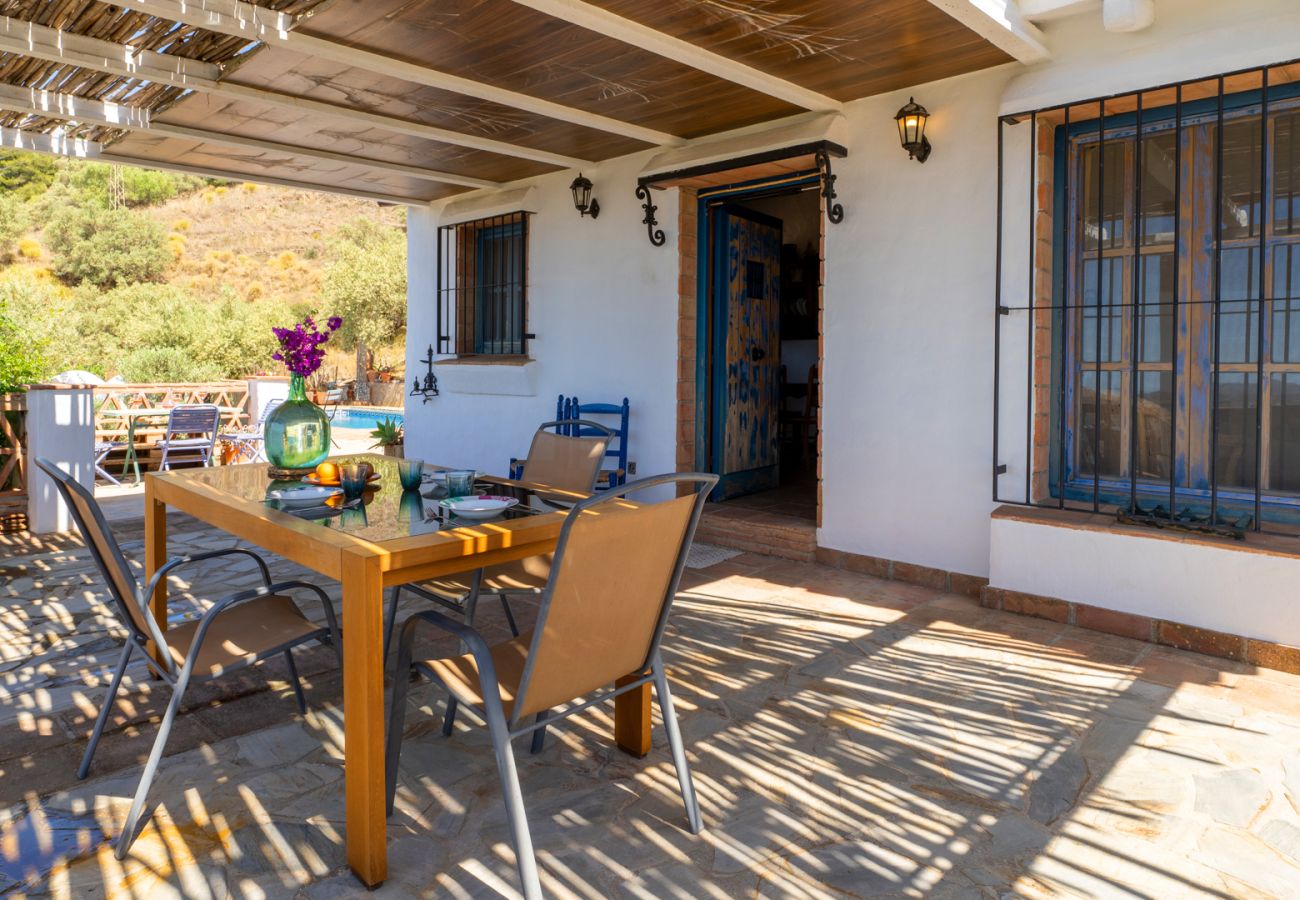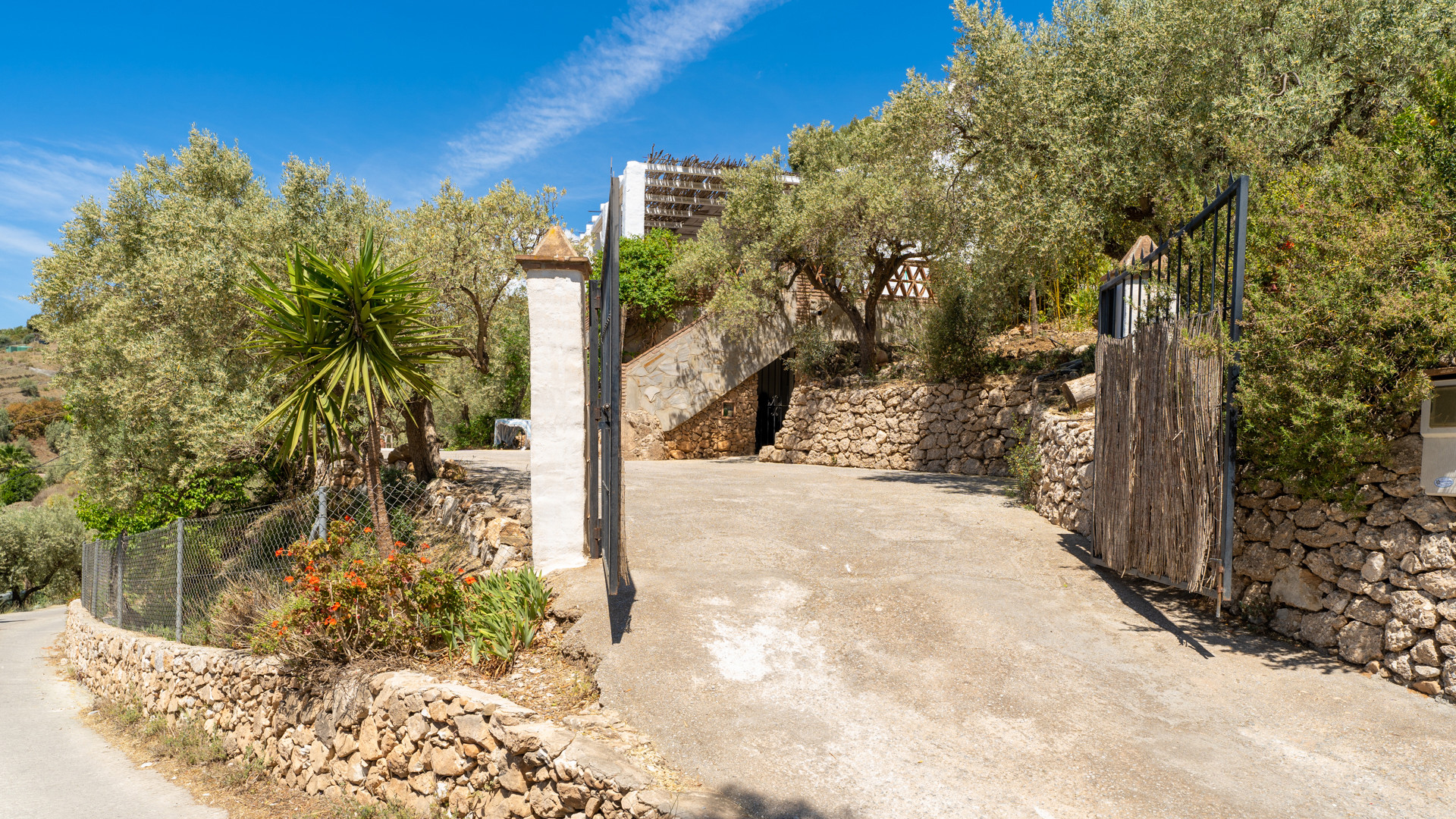 Het rustige huis ligt in een dominante positie tegen een heuvel en heeft een mooie tuin en fraaie uitzichten. Het privé zwembad van 6x3 meter lang en 1.2–1.6 meter diep is omringd door een zonnig terras met ligstoelen van waaruit u dezelfde unieke uitzichten heeft. Vanaf het terras loopt een trap omhoog naar het gedeelte met de barbecue waar de Japanse mispel zorgt voor de nodige schaduw. Een tweede trap leidt naar een aangenaam terras op de eerste verdieping. Dit met een pergola overdekte terras kijkt uit over olijfgaarden en over de Middellandse Zee. De ligging van het huis is rustig en vredig en ligt op 5 tot 10 autominuten van Frigiliana (6.8 kilometer). De stad Nerja met haar beroemde stranden en bruisende stadscentrum is met de auto bereikbaar in 15 tot 20 minuten (13.6 kilometer). Het huis is bereikbaar via een verharde landweg.
