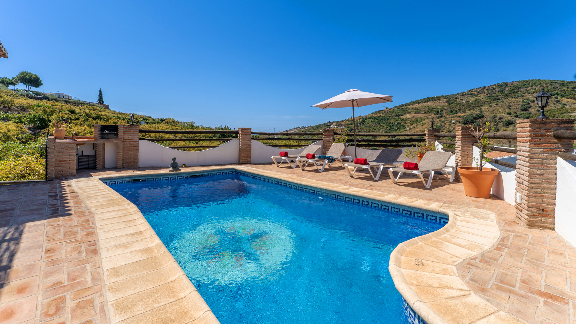 De villa ligt op een heuvel en is omgeven door weelderige avocadoplantages. Ze biedt een panoramisch uitzicht over de vallei van Frigiliana (3 km), met in de verte een glimp van de Middellandse Zee aan de horizon. Het overdekte terras aan de voorkant kijkt uit over het zwembad en is voorzien van een ingebouwde stenen barbecue – perfect om buiten te dineren. Het op het zuiden gelegen zonneterras rond het privézwembad (6 m x 4 m, diepte 1,65 m – 2,3 m) is uitgerust met comfortabele ligstoelen voor een hele dag ontspanning.