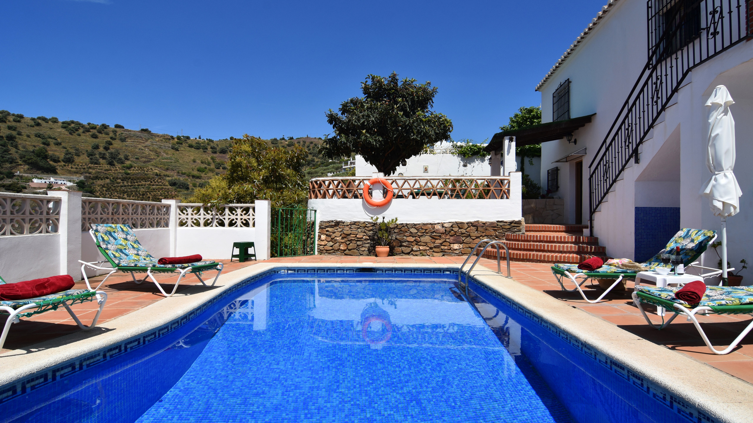 Het rustige huis ligt in een dominante positie tegen een heuvel en heeft een mooie tuin en fraaie uitzichten. Het privé zwembad van 6x3 meter lang en 1.2–1.6 meter diep is omringd door een zonnig terras met ligstoelen van waaruit u dezelfde unieke uitzichten heeft. Vanaf het terras loopt een trap omhoog naar het gedeelte met de barbecue waar de Japanse mispel zorgt voor de nodige schaduw. Een tweede trap leidt naar een aangenaam terras op de eerste verdieping. Dit met een pergola overdekte terras kijkt uit over olijfgaarden en over de Middellandse Zee. De ligging van het huis is rustig en vredig en ligt op 5 tot 10 autominuten van Frigiliana (6.8 kilometer). De stad Nerja met haar beroemde stranden en bruisende stadscentrum is met de auto bereikbaar in 15 tot 20 minuten (13.6 kilometer). Het huis is bereikbaar via een verharde landweg.