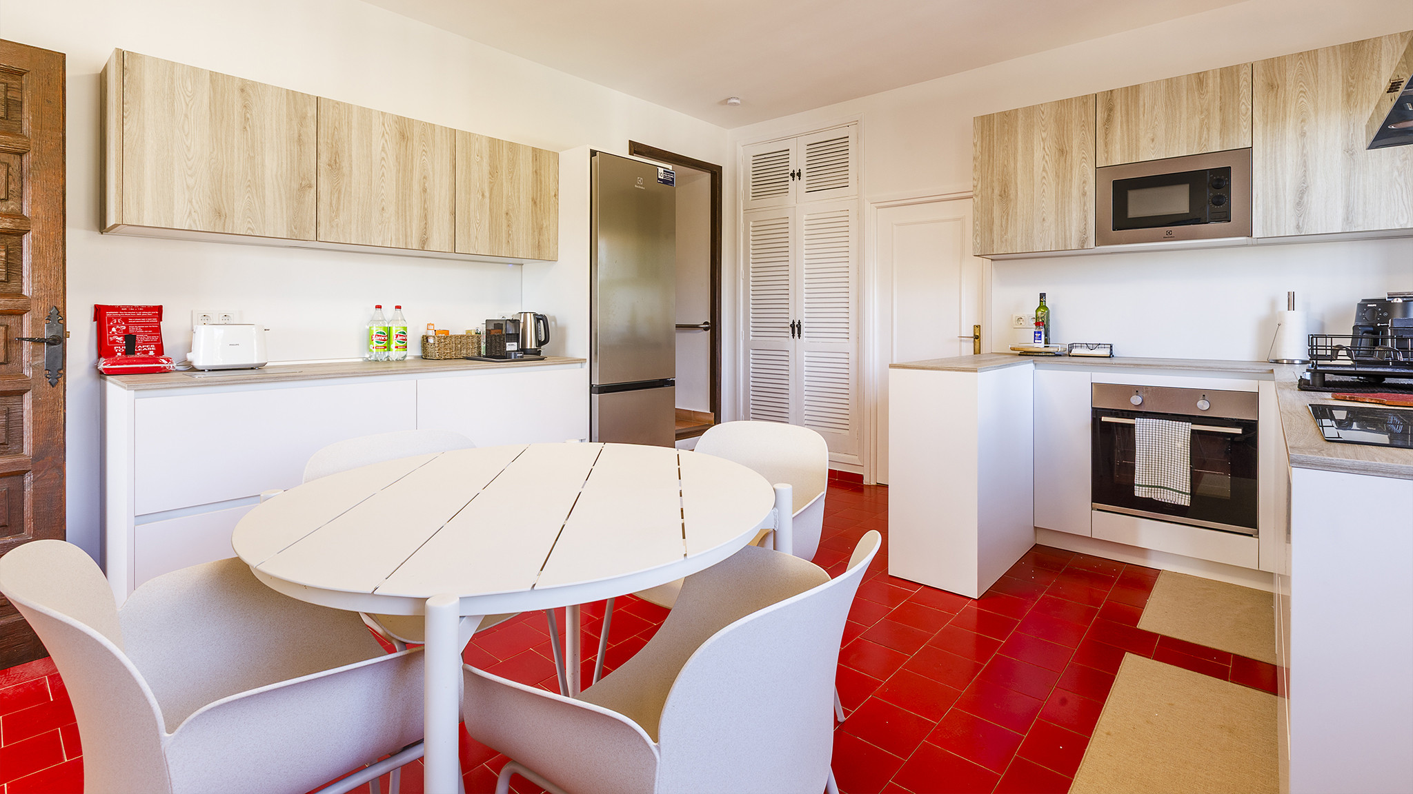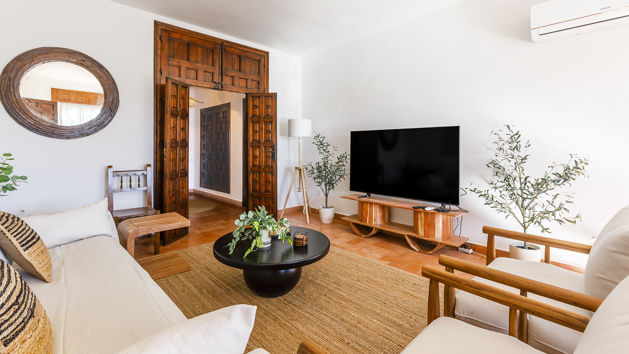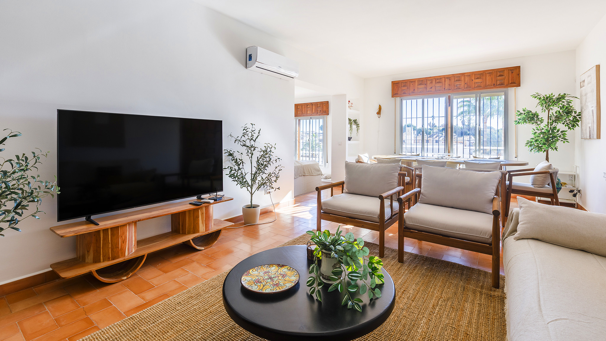 Binnen is de villa comfortabel ingericht. De woonkamer beschikt over gezellige banken en stoelen, een eethoek en een smart-tv met internationale kanalen. De onafhankelijke, volledig uitgeruste keuken biedt alles wat nodig is voor een ontspannen vakantie.