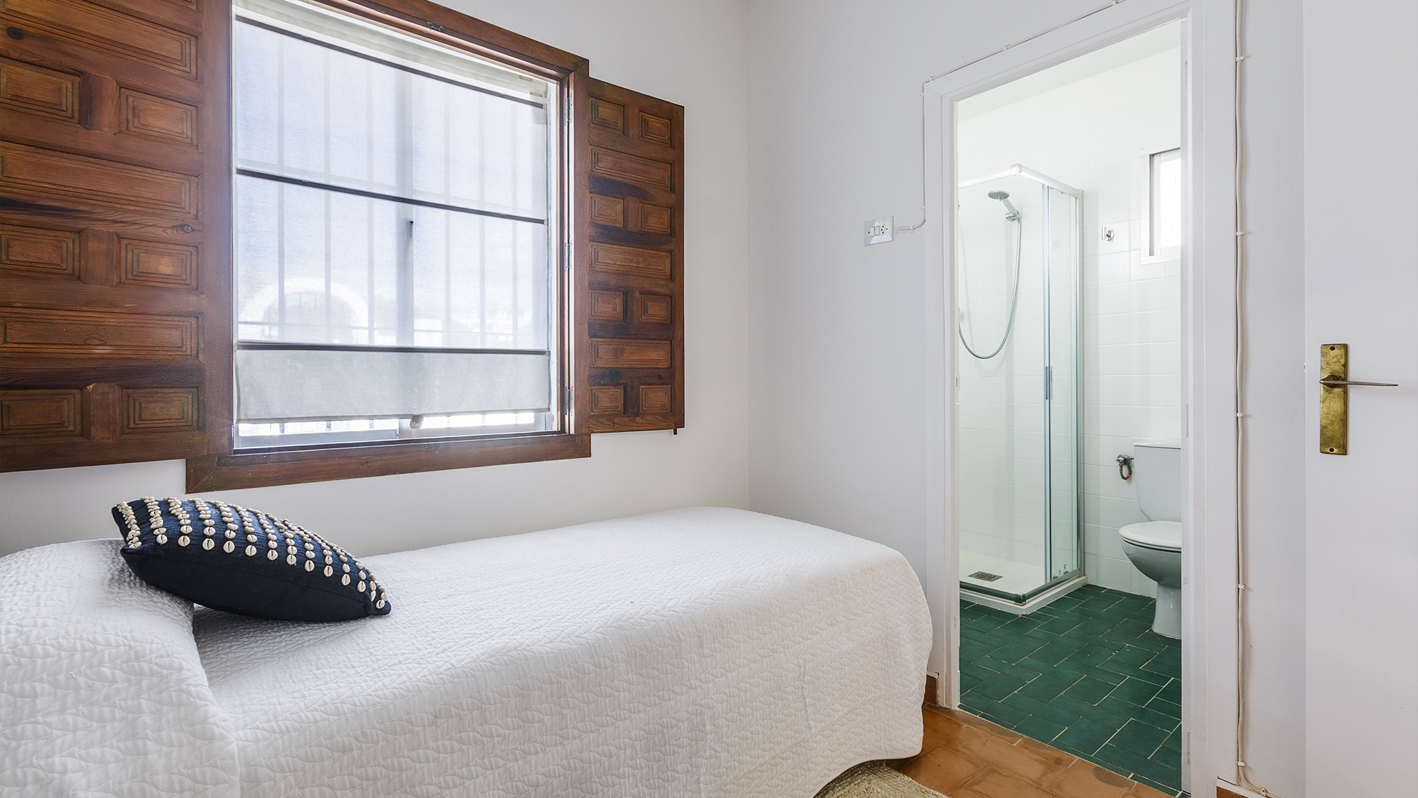 Een brede trap leidt naar de eerste verdieping met drie mooie romantische slaapkamers: een kamer met twee aparte bedden en twee slaapkamers met een tweepersoonsbed. De tweepersoonskamers hebben beide een eigen badkamer met een douche boven het bad en met wastafel, bidet en toilet. De kamer met de gescheiden bedden heeft een afzonderlijke badkamer met ligbad, wastafel en toilet.
